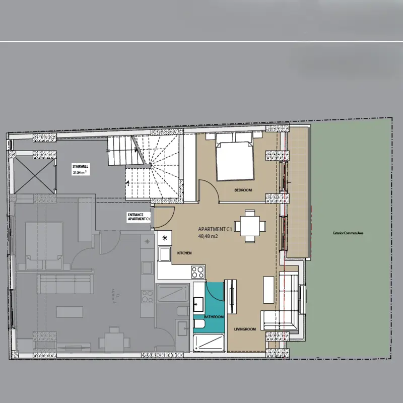 - 10 شقق سكنية أنيقة بنمط 1+1 بمساحة من 42 ولغاية 48 متر مربع.