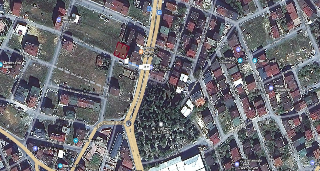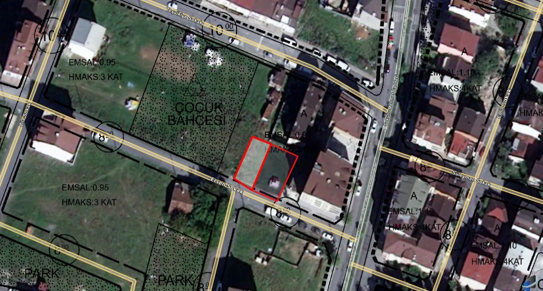 Two investment land plots suitable for residential building construction are for sale. Plot A is 162 square meters, and Plot B is 236 square meters, with a total area of 398 square meters. They are eligible for residential construction permits in the center of Arnavutköy, within Istanbul's developing areas, with a high construction ratio and are licensed for construction.