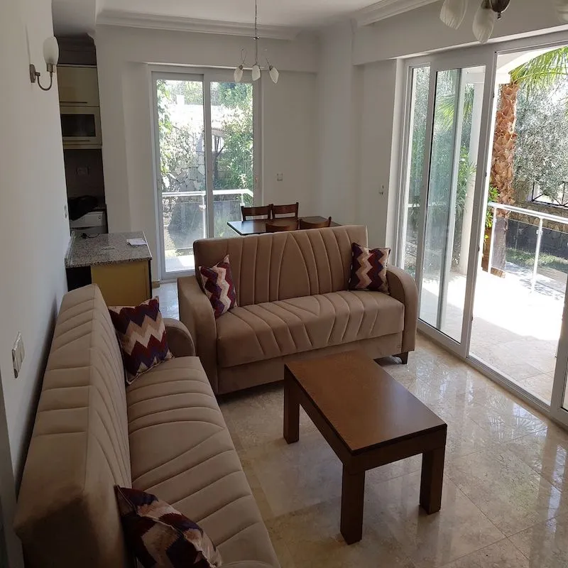 For sale, a residential apartment two rooms and a hall (2+1) , suitable for tourist investment within a boutique complex in the city of Fethiye, Mugla State, ground floor, apartment area 100 square meters, open kitchen, the complex contains an outdoor swimming pool and an outdoor garden, close to all public transportation.